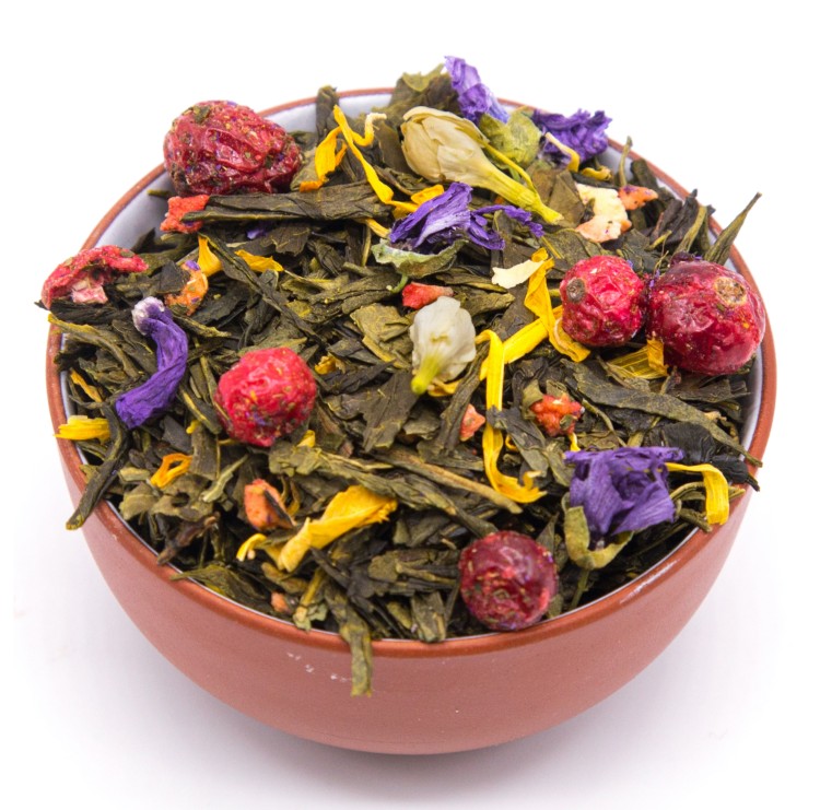 Купаж зеленого китайского чая сенча с кусочками клубники, ягодами красной смородины, бутонами жасмина, цветами мальвы и лепестками календулы. Имеет аромат сочной клубники и цветочный шлейф. Приятная сладость во вкусе понравится как взрослым, так и детям.