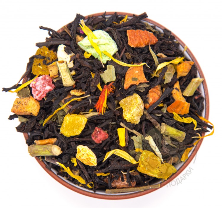 Чай черный индийский Ассам, ананас цукат, яблоко кусочки, апельсин цедра, ягоды вишни, календула лепестки, пищевой ароматизатор.