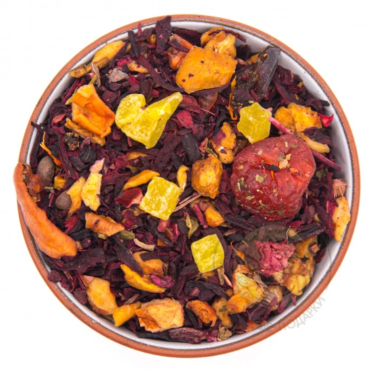 Фруктовый чай Вишневый пунш – это напиток с завораживающим названием и прекрасными вкусовыми качествами. Ароматное сочетание бордовых лепесточков гибискуса, рубленых ягод спелой вишни, кубиков медовой груши и яблок, шиповника и смородиновых листочков, пропитанное органическими маслами вишни. Настой богат микроэлементами, органическими кислотами, витаминами и массой других полезных для организма веществ.