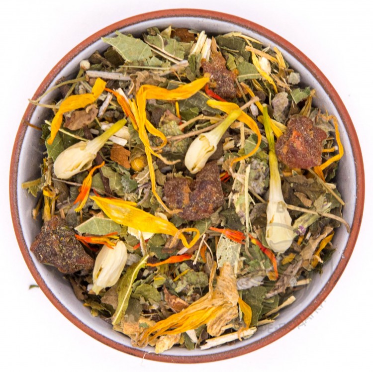 Липа, ежевика лист, яблоко, корица, имбирь, шалфей, цветы жасмина, календула лепестки